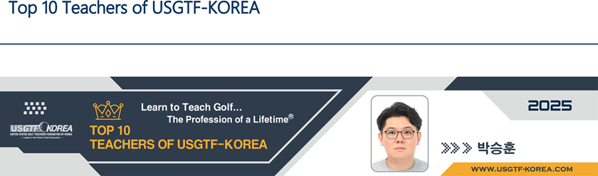 어려서부터 골프와 함께해 온 박승훈 프로는 끊임없는 노력과 뛰어난 실력으로 USGTF-KOREA 회원은 물론 모든 골프인에게 모범이 되어 왔다. 앞으로도 골프 지도자로서의 역량을 최대한 발휘하여 우리나라 골프 레슨 분야의 발전에 이바지하길 기대하며, 2024년도 USGTF-KOREA TOP 10 TEACHERS 중 한 명으로 선정한다.