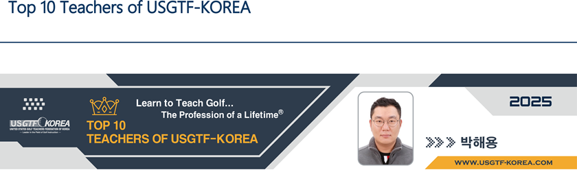 박해용 프로는 골프를 사랑하고 즐기는 모든 골프인에게 포기하지 않는 노력과 꾸준한 열정으로 본보기가 되어 왔다. 언제나 성실한 자세로 자기 발전에 힘쓰며, 지도자로서 모범적인 자세와 탁월한 실력으로 후배 지도자들에게 긍정적인 영향을 주고 있다. 그의 이러한 헌신과 열정은 한국 골프 레슨 문화 발전에 크게 기여하고 있으며, 앞으로도 지도자로서의 역량을 최대한 발휘하여 우리나라 골프 교육의 발전을 선도할 것으로 기대된다. 이에 USGTF-KOREA는 박해용 프로를 2025년도 USGTF-KOREA TOP 10 TEACHERS 중 한 명으로 선정한다.